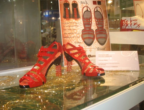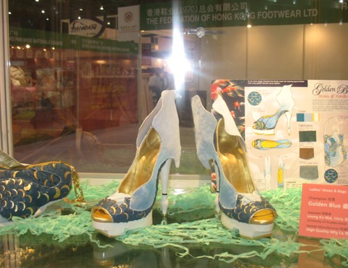 在展會現場,除了可以看到成品鞋、手袋、鞋袋材料及機械四大主要展區之外,還有一個獨特的展區也吸引了不少觀眾的駐足觀賞,那就是第十一屆香港鞋款設計比賽的獲獎作品展示區。一雙雙獨具匠心的鞋款充滿著作者的奇思妙想,新穎設計及創作意念更是令人嘆為觀止。有充滿中國元素的“60年的光榮路”、“楚河漢界”、“青竹瓷器”、“囍”,還有前衛時尚的“首長的女兒”、“引誘物”、“人魚公主”、“盛藍”、“孔雀”等等作品,充分將傳統與現代、流行與經典完美結合,演繹出最具潮流趨勢的個性化鞋款。