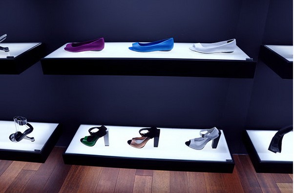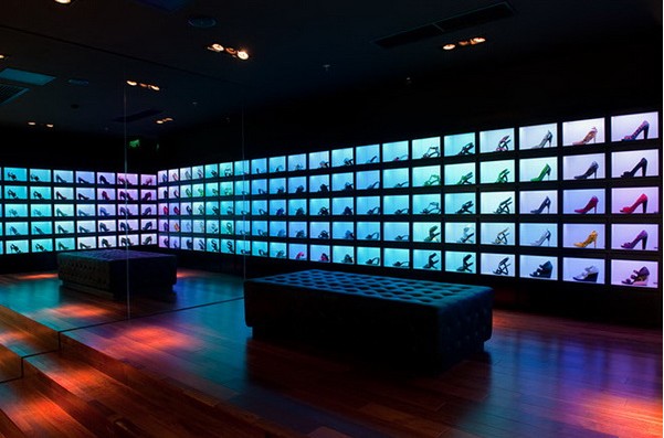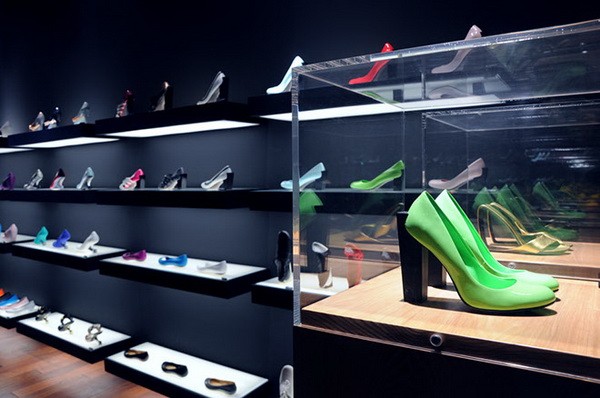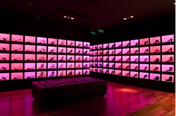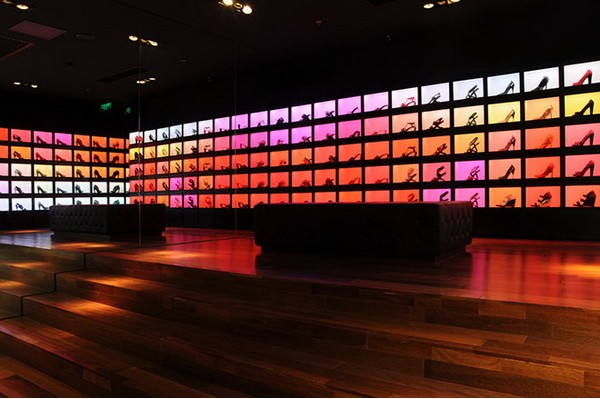 在幽暗的店鋪內陳列一排排由正方形格子組成的展示墻,每一個方格中都有一組LED燈,作為主角的一雙雙鞋子在顏色變幻的燈光烘托下,成為視覺焦點。整個店鋪空間帶著夜店般的奢糜,戲劇性濃郁,神秘卻又不喧賓奪主,跟設計感十足的鞋履相得益彰。(-最權威最專業(yè)的鞋業(yè)資訊中心,)