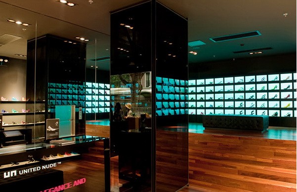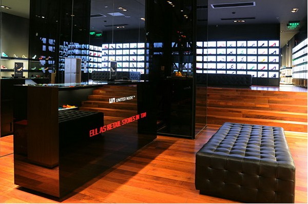2010年6月,繼紐約以及阿姆斯特丹店后,United Nude全球的第3個旗艦店入駐上;春V新。該店繼續(xù)沿用了阿姆斯特丹店的“Wall of light(燈墻)”展示柜概念,設計靈感來源于一個取暖的火爐,每雙鞋子就像放在不同盒子里的一把火,所有鞋放在一起形成了一個光亮的墻壁,店鋪周邊設計的主調都是黑色的,這讓鞋子能充分擔當主角。