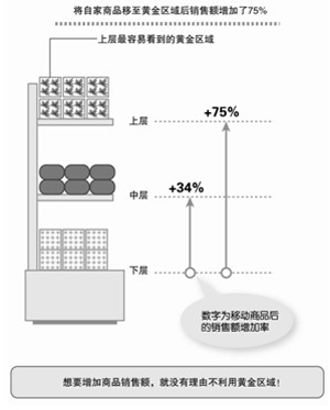 為什么是黃金區域?看看圖2的調查就清楚了。這個調查是顯示將某款商品(同樣的陳列數量、同樣的陳列方法)移動至不同高度貨架時銷售額的變化數據。如圖,把商品從下層移至中層時,銷售額增加了34%,而將下層的商品移至黃金區域的上層時,銷售額竟然增加了75%之多。當然,并非所有商品都能達到這一數字,但可以肯定的是,黃金區域對所有商品來說都具有促銷效果,所以,營銷人員自身必須認識到這一點。