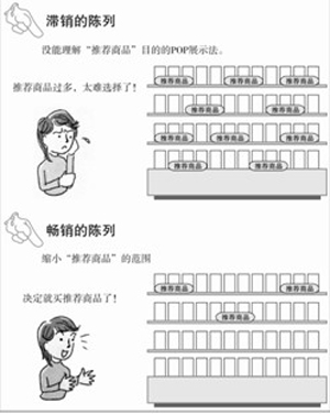 在挑選商品之際,不少顧客覺得商品種類過多,或是自己的商品知識不夠而猶豫不決。對待這種顧客的有效方法是標記出“推薦商品”,直接向其進行推薦,不過還需要注意,推薦的效果因顧客層和商品而異。有些顧客層比較容易接受“推薦商品”,而有些顧客則不然。