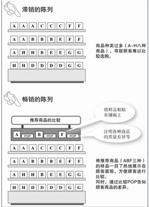 這樣看起來一目了然,也方便顧客比較選購各種商品。通過“比較型陳列”,顧客可以先瀏覽目錄后再進行選擇性閱讀,也能滿足顧客“自己親自選擇”的心理需求。