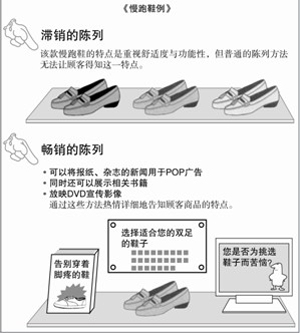同時,A公司也在該款鞋的陳列方面下了一番工夫。首先,廠商在店內宣傳展示了挑選鞋子的重要性,如圖1所示,廠商在POP廣告中摘取了報紙和雜志中介紹腳部相關健康知識的新聞,還展示了挑選鞋子和腳部健康的相關書籍,此外還制作了DVD宣傳影像,在店內放映給顧客看。通過這些努力,讓顧客學習到挑選鞋子的相關知識。