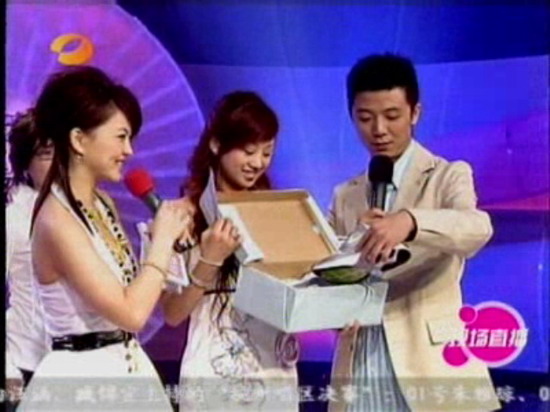 6月17日星期六12:30,湖南衛視現場直播2006快樂中國超級女聲成都唱區20進10晉級賽,新浪娛樂全程視頻圖文直播,譚維維、張曉多、熊文、王梓、劉悅、尚雯婕、吳薇、陽蕾、肖娉、曾媲佳、趙媛媛、三江組合、彭春霞、王未佳、蔡瑩瑩、李娟、施赟、喬維怡、陳鷺虹、吳雅夢角逐成都賽區10強。圖為07號施赟親友團送鞋。