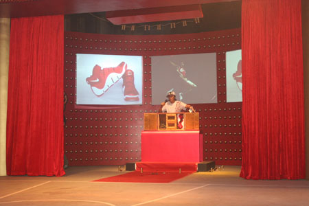 一陣技驚四座的舞獅表演點燃了狂歡的訊號,兩只不斷攀爬高竿的雄獅仿佛預示著小皇帝勒布朗不可估量的前途,當他們在空中吐出的兩條璀璨火花劃著完美的弧線飛向舞臺時,為小皇帝中國紅護駕的兩扇幕布也旋即散開,一道氣勢恢宏的古典宮門呈現在嘉賓眼前,飛速墜落的兩道火龍最終匯聚在城門中央,瞬間點燃了全場瀑布般的煙花門簾,高貴精致的NIKE Air Zoom LeBron IV限量版中國紅躍然出現在城門中,這雙球鞋的鞋盒酷似中國最偉大的皇家建筑故宮的大門,隨著鞋盒的緩緩打開,大紅的詹姆斯四代戰靴和盒內型似玉璽的龍型印章出現在全場球迷面前,處處彰顯著這雙球鞋的高貴的皇家貴氣。