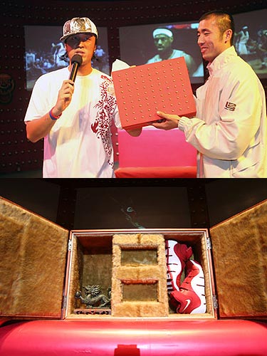 11月10日騎士隊大勝公牛隊的對決中,小皇帝勒布朗•詹姆斯首次穿上他的最新戰靴--NIKE Air Zoom LeBron IV限量版中國紅出現在NBA賽場上,掀起了一股狂熱的中國旋風。當晚,在中國廣州信義國際會館,Nike Zoom LeBron IV限量版中國紅的發布派對閃亮舉行。這場富有濃郁中國風情的派對吸引了來自內地、香港潮流圈的名人、涂鴉藝術家、收藏家和小皇帝的忠實粉絲,共同見證了小皇帝中國紅戰靴的驚艷風采。