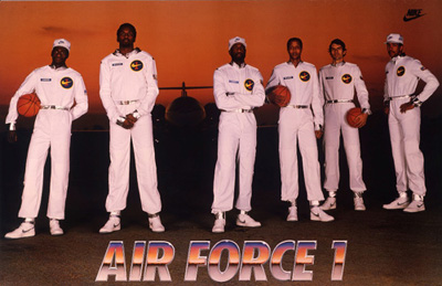 從Bruce Kilgore播下的第一顆種子起,Air Force 1就深深地根植于籃球運動之中。當時挑選了6位籃球運動員來代言這款鞋:摩西•馬龍(Moses Malone)、邁克爾•庫帕(Michael Cooper)、賈馬爾•威爾克斯(Jamaal Wilkes)、博比•瓊斯(Bobby Jones)、米切爾•湯普森(Mychal Thompson)以及卡爾文•奈特(Calvin Natt),他們是經過精心選出的防守專家,他們將這款籃球鞋帶到了世人面前。經典的海報,強硬的姿態,馬龍和他的伙伴們展示出AF1成功的六大要素:宏大、耐久、超越、豪邁、連貫和純粹。AF1征服了地球!