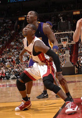 圖為今日凌晨的NBA圣誕夜大戰(zhàn)中熱火隊湖人隊的比賽,這場比賽不僅成為了兩位當家球星的對決,也成了倆人的新款戰(zhàn)靴的比拼,比賽的結果就像圖上的鏡頭,韋德以40分11次助攻4次蓋帽力壓科比獲得比賽勝利。