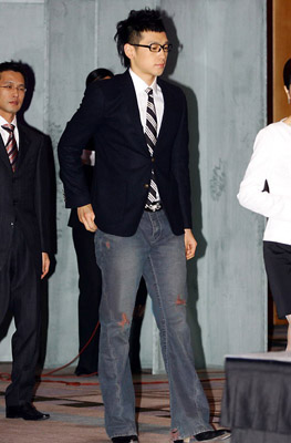 剃掉了兩側的頭發,前面的短發則齊齊梳下的Rain,當天帶了一副黑框眼鏡,身穿黑色西裝上衣和深藍色牛仔褲。但他的時尚裝扮可不只是這些哦!