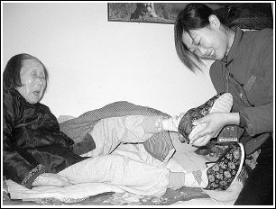 昨日上午10時許,社區郝主任就早早來到吳奶奶家,為老人穿試新鞋,老人三寸金蓮,足下長20厘米,屬于特制鞋類,老人喜歡穿布鞋,但腳面高低不一,尺碼必須量制得恰到好處,足足20多分鐘的時間,才為老人度量完畢。廠家還給老人帶來了一雙免費贈送的棉布鞋,比老人的腳稍大。郝主任說,先讓老人穿著,冬天以免凍傷腳,等定制的鞋子做好后,再穿新鞋。