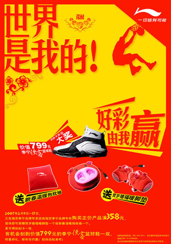 “世界是我的!好彩由我贏。”自2007年2月9日至2月17日,凡在指定李寧品牌專賣店購買正價產品滿358元,即可獲得新春好禮一份!還有機會贏取價值799的俠客籃球鞋一雙。先到先得,送完即止。詳情請見店內海報。