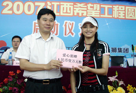 在捐出1萬元現金后,曹穎希望自己只是起個帶頭推動作用,希望大家都參與到愛心活動中來!皦粝朐陲w·2007江西希望工程圓夢行動”需要大家的參與和支持。
