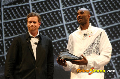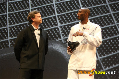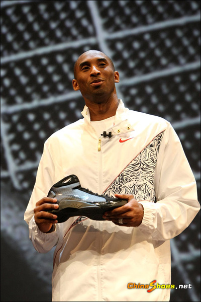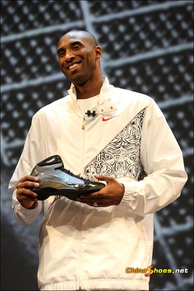 科比出席某品牌奧運(yùn)巔峰會(huì) 微笑展示新球鞋。