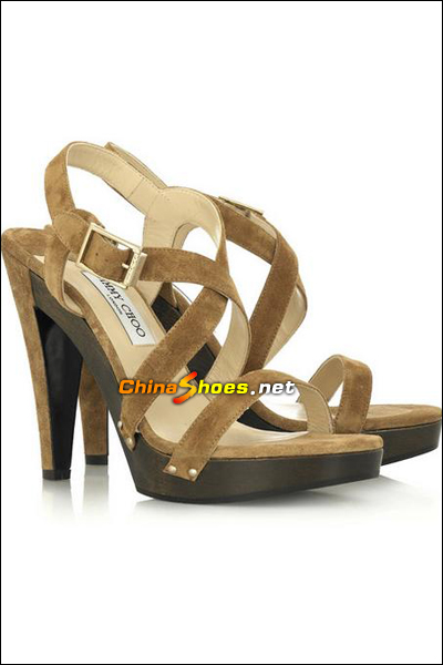Jimmy Choo 2009春夏女士棕色反皮高跟鞋將陪伴你踏進(jìn)春天這個(gè)季節(jié)。棕色的駱駝麂皮絨質(zhì)地充滿著反叛和野性的氣息,露趾的鞋頭和十字形交叉皮帶的設(shè)計(jì)搭配牛仔褲或者迷你裙會(huì)讓你看起來(lái)時(shí)尚極了。
