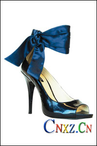 深藍(lán)色緞帶蝴蝶結(jié)帶出女人神秘性感氣息,高跟鞋魚口設(shè)計讓此款鞋更具魅力。