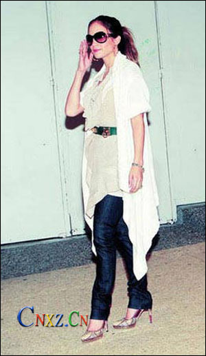 米色上衣與白色裁減不規則的罩衫疊穿,搭配藏藍色窄腿褲和米色高跟鞋,內斂而不低調,讓Jennifer Lopez如詩歌般美麗動人。