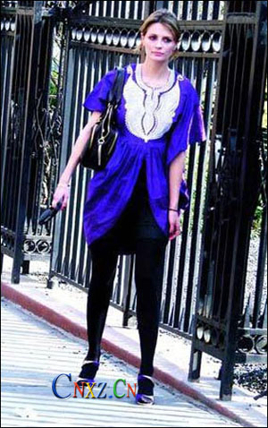 紫色寬松罩衫不論是胸前鉤花的設計還是裙擺處微微內收的花朵造型,都讓Mischa Barton與身懼來的公主氣質有了更加完美的傳達。