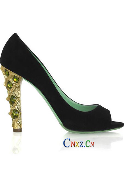 黑色條紋皮革打破沉悶的氣氛,高達12厘米的鞋跟把深紫色鞋底顯示在大眾面前,彰顯神秘的女人味。鞋跟與水臺側面是斑駁的暗紋,有一種復古、舊著的意味。高達4厘米的水臺使穿著者感到更舒服,穿梭在宴會賓客中也游刃有余。