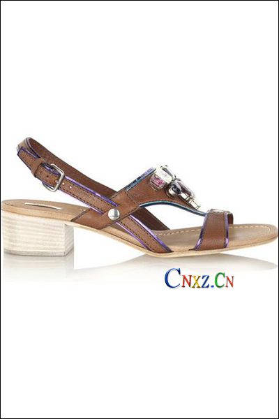 咖啡色皮質船跟涼鞋帶有粗獷的勇士味道,大顆水晶點綴在鞋面使平凡的涼鞋增添奢華感。皮帶鑲有紫色和湖水藍的細邊,加上粗細有致的皮帶剪裁,是這款鞋子的加分亮點。配上黑色連衣裙是周末拜訪朋友的最佳選擇。