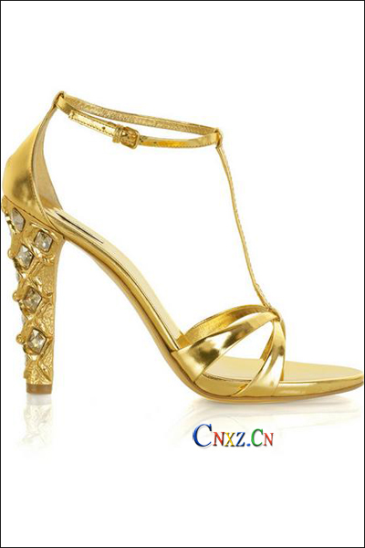 除了奢華二字沒有其他字眼能形容這雙miu miu2009春夏金色高跟鞋。淺金色的皮革搭配高達5英寸的鑲滿耀眼的施華洛世奇水晶的鞋跟,無法讓你躲藏在人群中。涼鞋造型令人感受到自由與奔放的氣息。