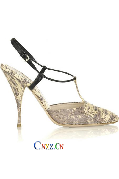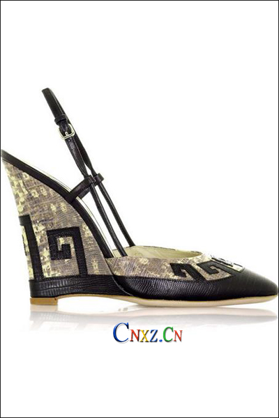 這雙復古氣息極濃厚的蛇皮圖騰涼鞋,靈感來自于二十年代的風尚,設計師極具奢華地使用了流行的金色,還添加了一些時代的元素,穿起它的女性進出雞尾酒場所尤顯高貴。丁字鞋帶處則使用了黑色高級皮革,與金色蛇皮的閉口鞋頭形成了強烈且有個性的對比效果。