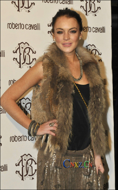中國鞋網03月02日訊,在倫敦出席2010秋冬米蘭時裝周的林賽・羅韓參加Roberto Cavalli品牌秀發布后的晚宴。蓬松長毛坎肩搭配閃亮質地的寬松褲型,點綴金屬飾品,華麗而優雅,不愧是眾人效仿的party girl。