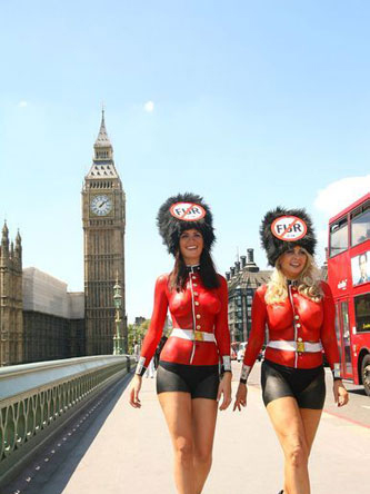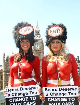 中國鞋網05月26日訊,英國倫敦,PETA為保護熊類皮毛再出狠招,此番招來游戲版本《古墓麗影》的代言姐妹花露西-克拉克森(Lucy Clarkson)性感出鏡。兩位美眉穿著極其貼身的女王親衛隊警服現身,仿皮草的帽子正是PETA強調No Fur的重點。只見姐妹花傲然的上圍一個比一個有看頭!更是穿了黑色的丁字褲大玩誘惑呢,試問怎么能不吸引路人眼球呢!