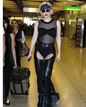 Lady Gaga身穿皮革套裝和長及3英尺的皮革斗篷優雅的出現在倫敦希思羅機場,引起了人們的關注。黑色的墨鏡和頭巾也非常的個性。在優雅行走的時候踩到了自己的斗篷,12厘米的高跟鞋讓Lady Gaga難以為此唯美形象。