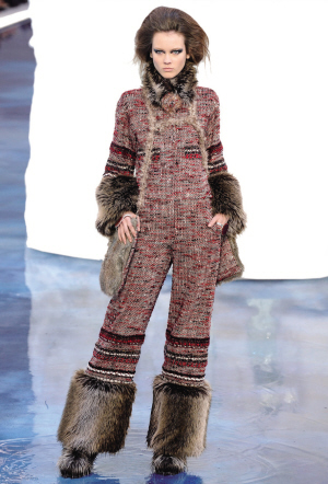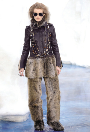 Chanel的創意一向高瞻遠矚,這回,卡爾·拉格斐以地球暖化為議題,在巴黎大皇宮內將瑞典北部的冰山作為Chanel這次秀的場景,當發布會進行時,暴露人前的冰山開始慢慢融化,T臺頓時出現“水漫金山”的壯觀場面。模特們身著被稱之為“夢幻皮草”的抗寒冬衣在冰水中逆水而行。在零下4攝氏度的環境中,御寒系數與時髦系數都超高的皮草當然是必不可少的。模特們個個都打扮得像愛斯基摩人,長及膝蓋的毛皮靴、毛皮夾克無處不在,卡爾甚至把模特的整條腿都用毛皮包裹起來。