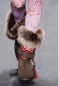 與其他品牌明顯不同的是,安娜·蘇(Anna Sui)明顯走著一條異域風情路線。本季它依舊玩著熱得似乎過了頭的印花元素,但其裝點了印花元素與流蘇垂飾的皮草靴更加具有了蒙古或東歐的風情。也正因為如此,2010秋冬秀場上最值得買的皮草鞋非它莫屬。