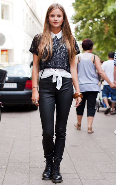 內搭一件白襯衫,將黑色的蕾絲漁網裝也能穿的帶有點小商務的氣質了。