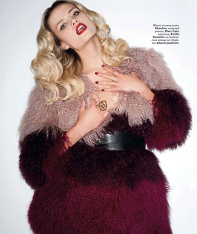 中國鞋網09月30日訊,超模Natasha Poly近日登上俄羅斯版Vogue十月號封面,并由攝影師Terry Richardson掌鏡拍攝了一組以皮草和絲綢為主題的時裝大片。在Simon Robins的打造下,這位金發紅唇的美人兒身披各式搶眼的亮色皮草,搭配質地柔軟的印花絲綢,明快醒目的色彩占據整個視線。原來皮草不只屬于深色或灰色,即使在寒冷的秋冬,大膽而張揚的亮色皮草足以揭示你的似火熱情!皮草就該如此張揚!