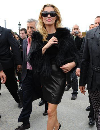 中國鞋網10月05日訊,英國超模凱特·摩絲一直都是時尚界的風向標,除模特身份外,被人們談論最多的就是她的設計師身份,從Topshop 到最近為瓏驤 (Longchamp) 設計手袋,凱特·莫斯 (Kate Moss) 通過不同面展現著她的時尚好品味,她的穿衣打扮時常會在流行界引起人們紛紛仿效。新近的巴黎2011春夏時裝周上,凱特·摩絲身穿奢華皮草出現在大牌秀場上。這會不會預示著來年的某種流行趨勢?