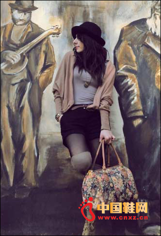 這樣的裝扮充滿了藝術氣息,短褲加絲襪搭配碎花包包浪漫優雅。灰色長襪再疊搭既保暖又有型,充滿藝術感。