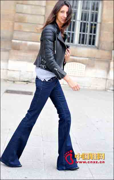 短款機車夾克搭配修身復古喇叭褲,長腿效果實在驚人