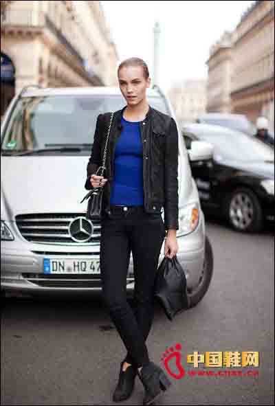 黑色鏈條爆搭配短夾克、低腰skinny、粗跟及裸靴,在用以件寶藍色緊身Tee打底體諒,整套裝扮簡介帥氣又不覺沉悶