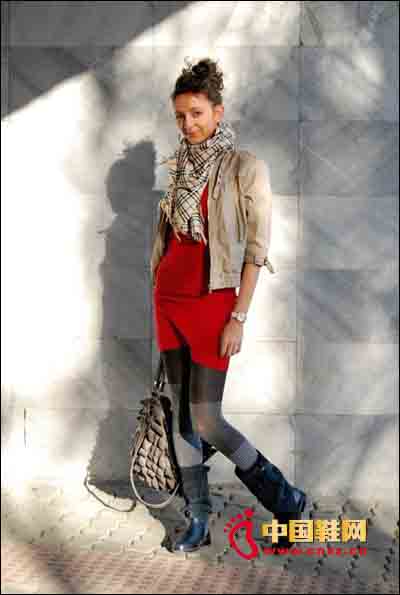 格紋圍巾搭配征紅色針織連衣裙與淺黃短夾克,十分漂亮,不過,三色Leggings稍嫌花哨