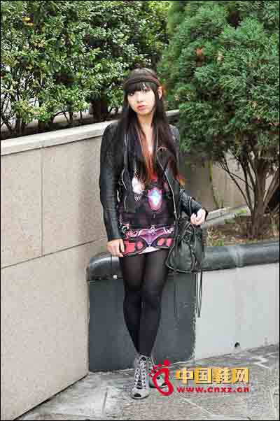 機車夾克機車包,鮮艷的街頭風印花長T,完美的黑色搭配無懈可擊,棕色發帶帶來一絲嬉皮感
