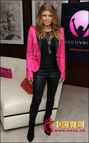 Fergie絕對不算是一個瘦子,她的身材屬于勻稱健美型,所以穿緊身皮褲的時候可以選擇搭配一件搶眼的玫紅色西裝外套,將別人的注意力重點集中在上半身,而且通過顏色的對比也能讓雙腿看起來更修長些。