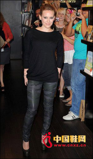 Hilary Duff可是個豐滿的女孩兒,她也敢穿皮褲?沒錯!這條帶有迷彩圖案的皮褲用深色調的印花模糊了雙腿本身的形態,讓腿的粗細不是那么直接的傳達給觀眾。