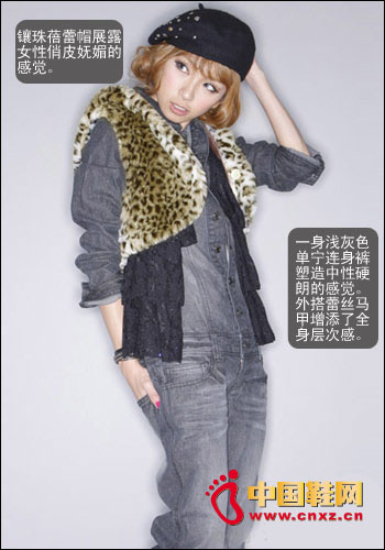 游牧風格一直風行,只是這一季更加硬朗和野性。立挺的工裝單寧連衣褲外疊馬甲,里面一層是蕾絲蛋糕馬甲,在男孩子氣中透點小性感,外面再套一件豹紋短款仿皮草馬甲,不僅俏皮而且這種雙馬甲的設計豐富了全身服裝的層次感,頗具心意,使奔放、華麗、率性感覺集于一身。