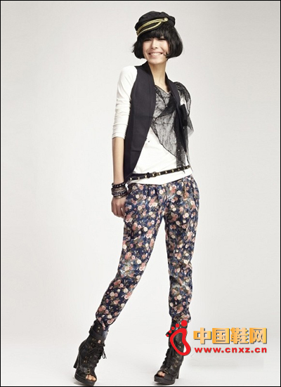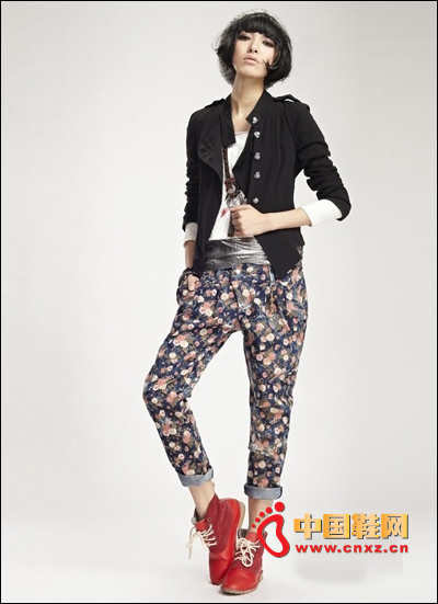 油畫碎花褲子,跳脫平凡,黑色氣場十足的外套,復古騎士的氣派,利落帥氣。
