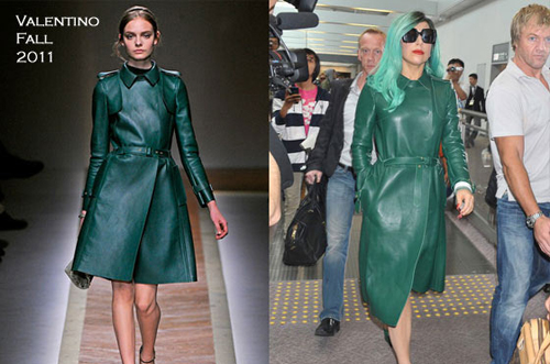 中國鞋網(wǎng)6月23日訊,Lady Gaga近日貌似改走大牌路線,從前追捧的個性品牌是否已經(jīng)穿厭了?繼上一次身穿范思哲的舞臺裝后,這次她又身穿綠色的華倫天奴2011秋冬款皮衣亮相機場。