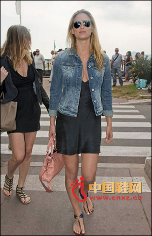 Bar Refaeli的平底涼鞋雖然結構非常簡單,但藍色的鏈珠卻透著幾分埃及女王的感覺,艷麗又性感,搭配藍色的牛仔外套整體更顯和諧。