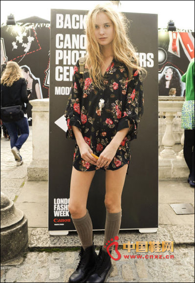 黑色雪紡上渲染著桃紅色大花,這樣的布料今年被普遍運用在高級定制服裝中,精致的長款項鏈和混搭的卡其色長筒襪,都烘托出了小女生的靈巧氣質。馬汀靴今年繼續橫掃時尚秀場。