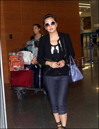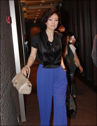 鞏俐一件簡單利落的黑色上裝搭配藍色闊腿褲,不加任何配飾不是低調,而是為了突出手中的這款鱷魚皮小手提袋。