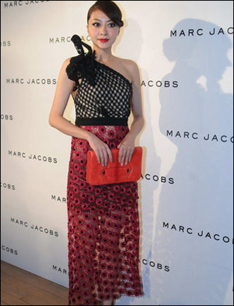 熊黛林身著MARCJACOBS“紅與黑”花飾單肩針織鏤花大露背長裙,搭配紅色鱷魚皮手拿包,復古盤發+紅唇妝更顯美艷。