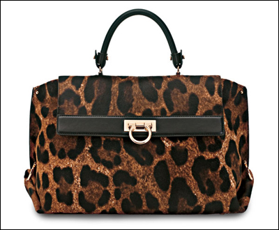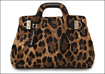 豹紋手袋也是Salvatore Ferragamo 2011初秋的必備單品。W手袋以奢華牛毛仿馬毛材質(zhì)打造精美豹紋印花,搭配雙“Gancino”金屬卡扣及品牌吊牌,將成熟優(yōu)雅與個(gè)性獨(dú)特融為一體。