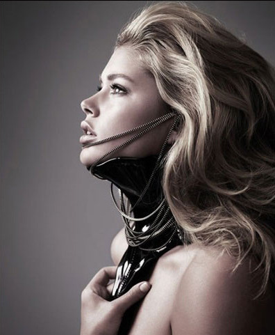 這組照片由攝影師AlexiLubomirski拍攝,在每張照片中,科洛斯都會穿著一件質(zhì)地較為硬朗的皮質(zhì)服飾:高跟皮靴、上衣、眼罩、項鏈等,而在這些照片中科洛斯穿著柔軟的絲綢服飾與皮質(zhì)想配合,兩種質(zhì)感的服飾以及科洛斯柔和的眼神配合在一起,性感撩人。