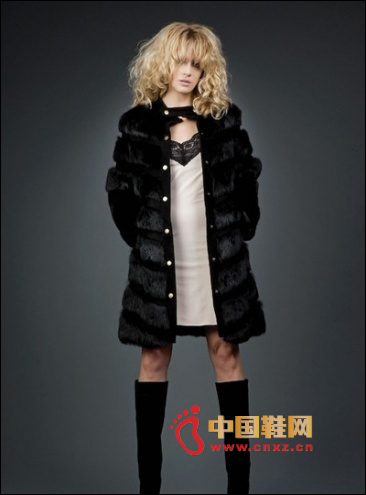黑色的皮草大衣,一般都會略顯沉悶,但是如果換一種穿法,與裸色蕾絲花邊的背心裙穿在一起,就增添了不少輕熟女味道,搭配上及膝的黑色靴子,比例上分配的十分得當。
